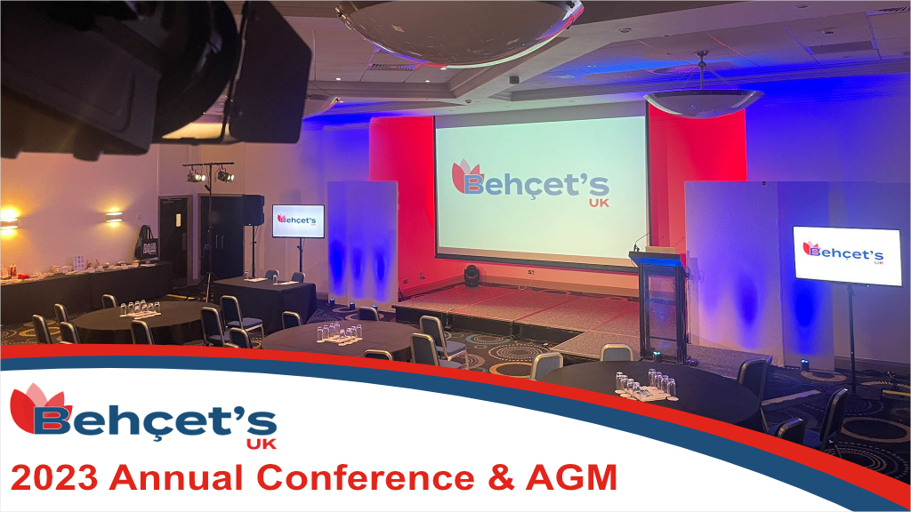 Conference room with chairs around tables for attendees and 2 large screens showing the Behçet’s UK logo. With the text which reads "Behçet's UK 2023 Annual Conference & AGM"